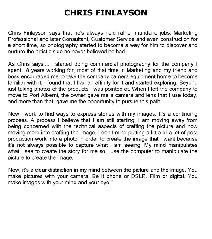 Chris Finlayson says that he's always held rather mundane jobs. Marketing Professional and later Consultant, Customer Service and even construction for a short time, so photography started to become a way for him to discover and nurture the artistic side he never believed he had..... read more