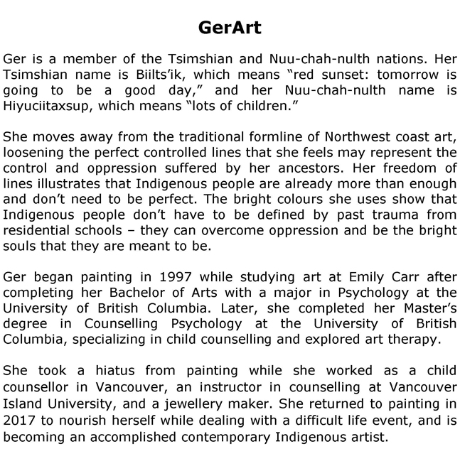 Ger is a member of the Tsimshian and Nuu-chah-nulth nations. Her Tsimishian name is Biilts'ik, which means "red sunset: tomorrow is a good day", and her Nuu-chah-nulth name is.... read more