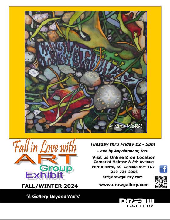 FALL IN LOVE WITH ART!- Group Exhibit Currently showing the works of an eclectic mix of local Vancouver Island Artists. Works in glass and copper, paper and cedar, photographic giclees, ink, paper and painting.