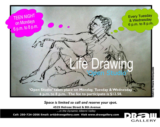 Life Drawing 'Open Studio' sessions - Teen Night Monday's 6 to 8pm and Adults meet every Tuesday & Wednesday 6 to 8 pm. Cost is $12.50. Space is limited. Contact us to reserve your spot if you are interested in participating!